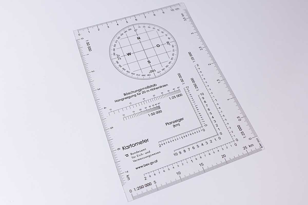 - Überleger für Landkarten mit Gefällezähler, Distanzzeiger für verschiedene Maßstäbe usw.