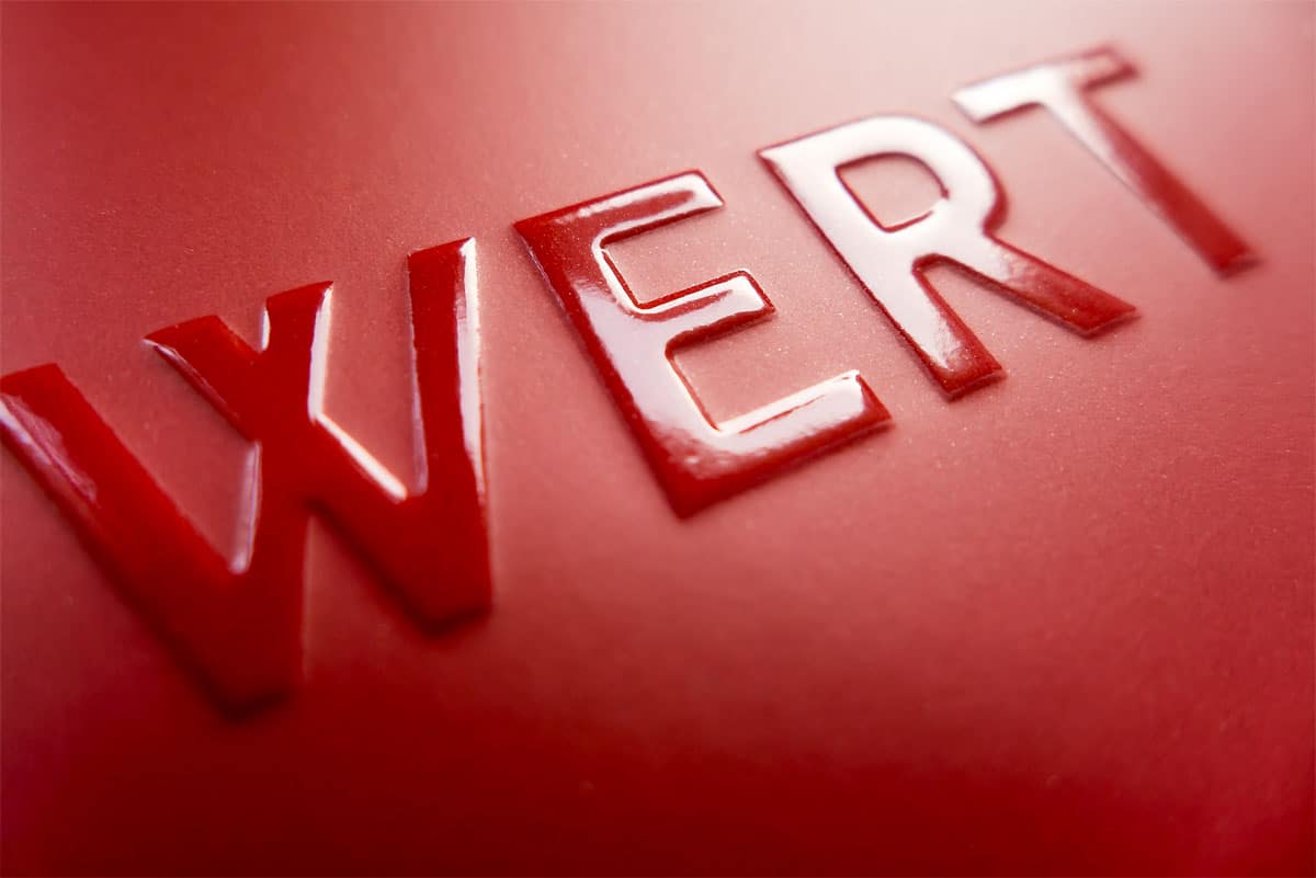 Das menschliche Auge fokussiert stärker auf ablenkende Farbkontraste als auf Höhendifferenzen. Die Prägung eines kontrastreichen Motivs, also etwa eine schwarze Überschrift auf weißem Papier, fällt daher kaum auf. Abhilfe: Hohe Farbkontraste meiden oder eine optische Verstärkung durch Lichtreflektion einbauen. Das geht über Metallisierung oder partielle Hochglanzlackierung des Prägemotivs.