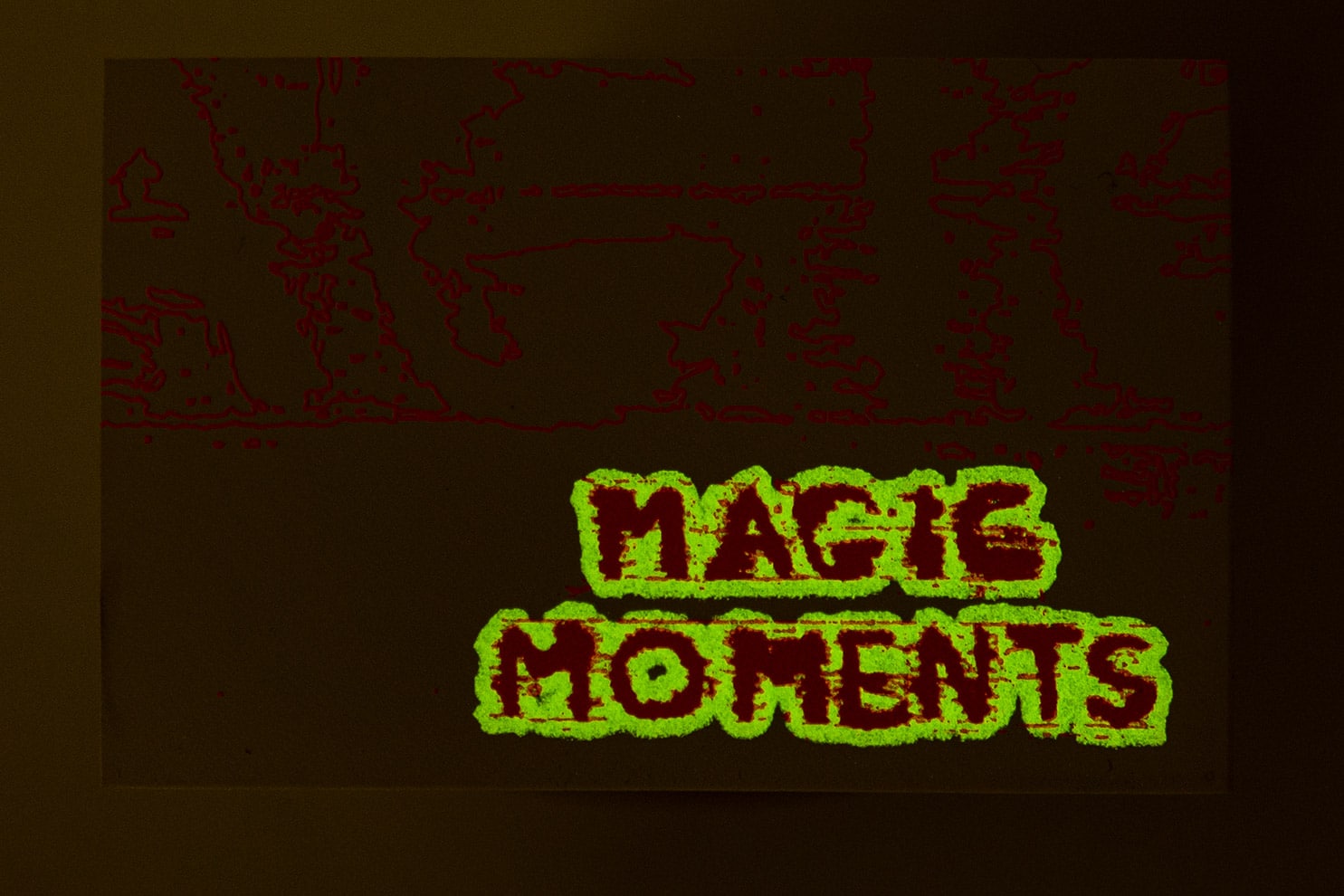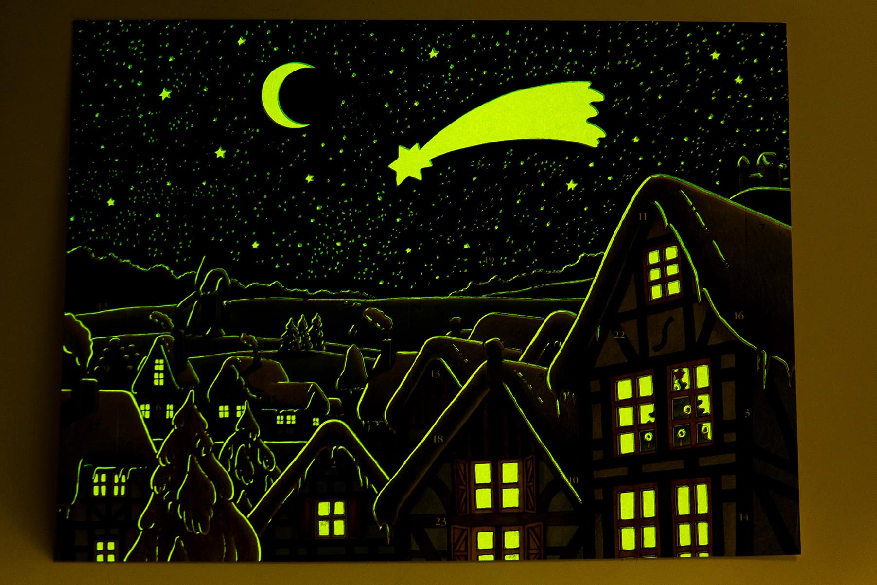 Fachlich gesehen spricht man von phosphoreszierender Farbe, international gerne von einem „glow in the dark“ Effekt.