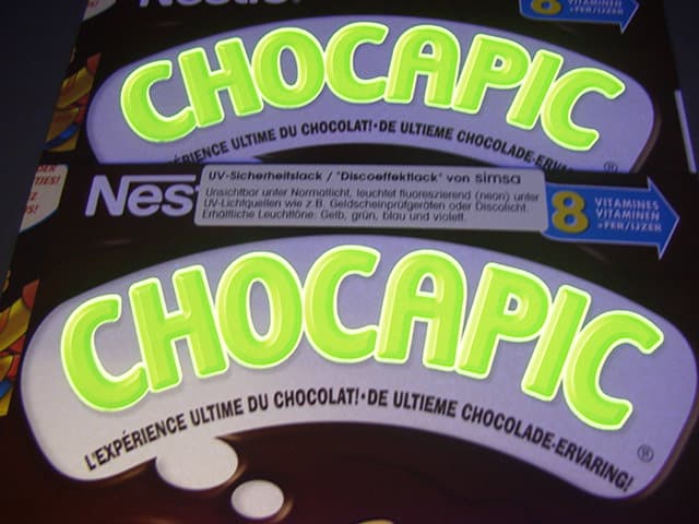 Die erforderliche Lichtwellenlänge findet sich in Geldscheinprüfgeräten und kurioserweise auch im sogenannten „Schwarzlicht“ oder „UV-Licht“ von Diskotheken. Neben der Anwendung im Sicherheitsdruck, etwa als Fälschungsschutz bei Gutscheinen oder Dokumenten, wird der Lack daher auch gerne für verblüffende Werbung in Diskotheken, Bars und Nachtlokalen verwendet.