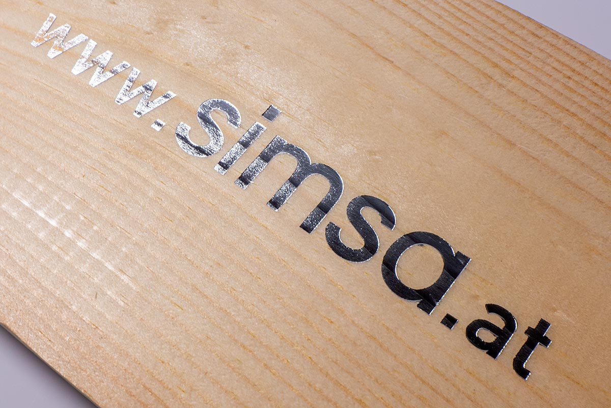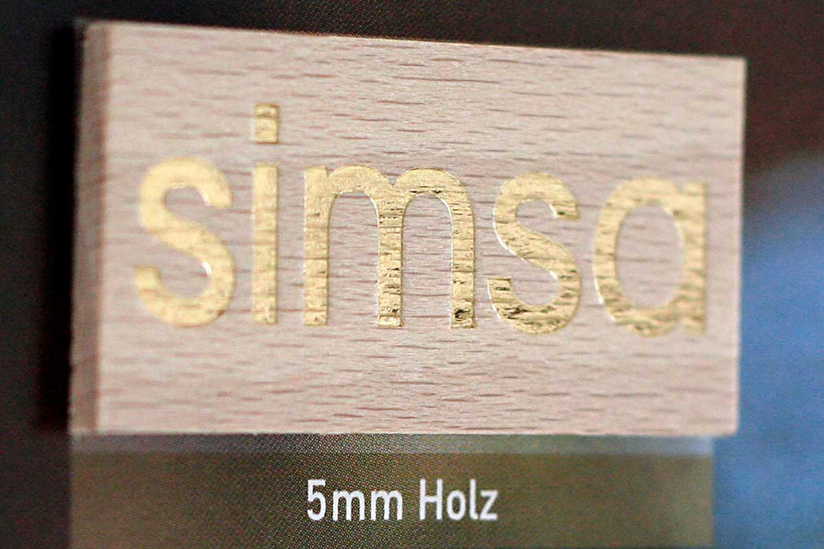 Holzfurniere, Holzstaffeln und Holzplatten beschriften wir mittels Heißfolienprägung zudem echtmetallisch in Gold, Silber, Kupfer und metallischen Buntfarben mit Texten und Logos. Auch hier bis 50mm Materialstärke.