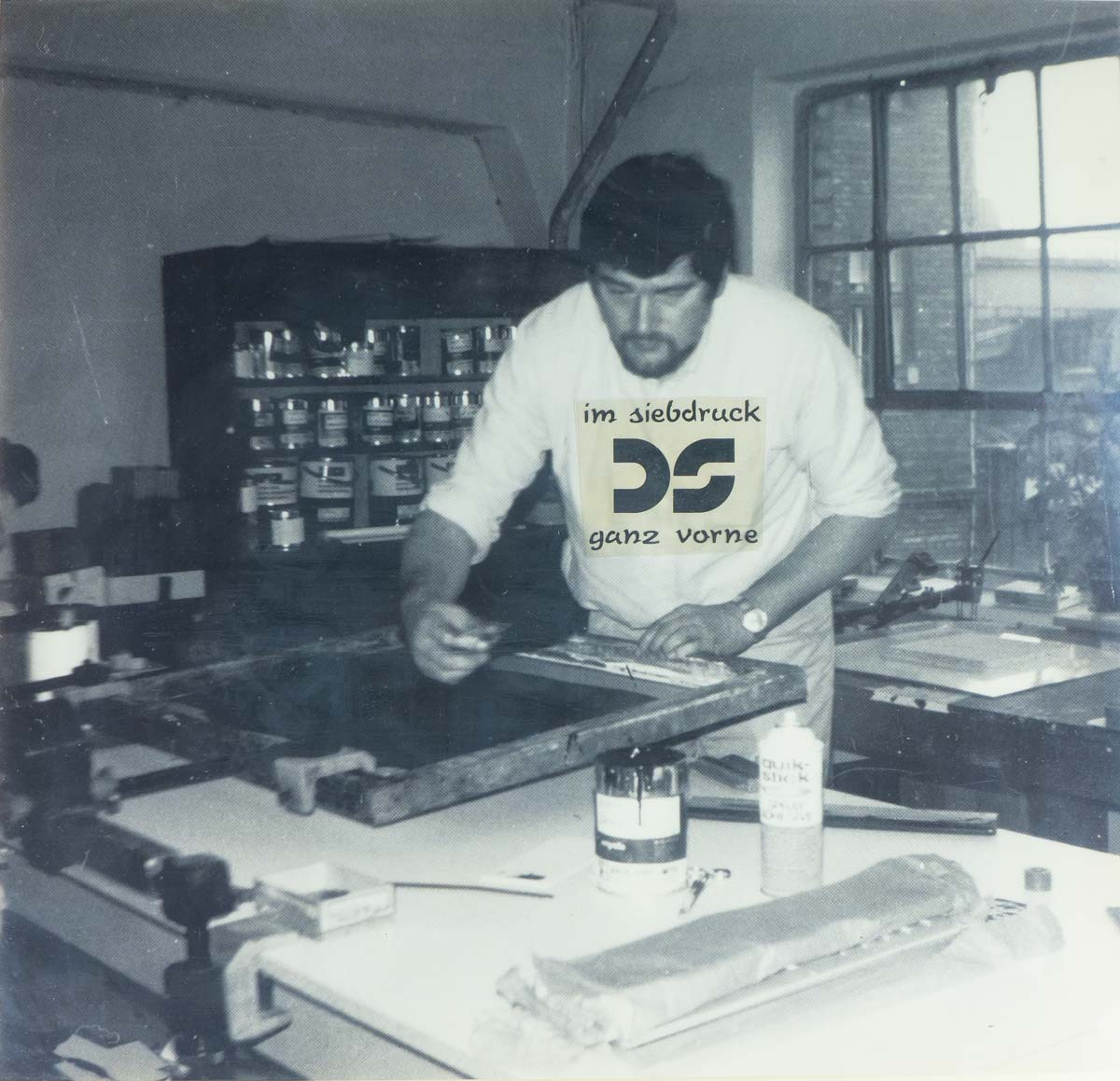 Am 01. Juli 1972 holt sich Karl Simsa seinen Gewerbeschein und macht sich nach knapp 20-jähriger Erfahrung in der Druckbranche selbständig. Der erste „Produktionsstandort“ ist der familiäre Esstisch in der Küche der Privatwohnung in der Hanson-Siedlung im 10. Wiener Gemeindebezirk. Gestartet wird mit nur einem Kunden, mit händischem Siebdruck auf Steckteile aus Kunststoff